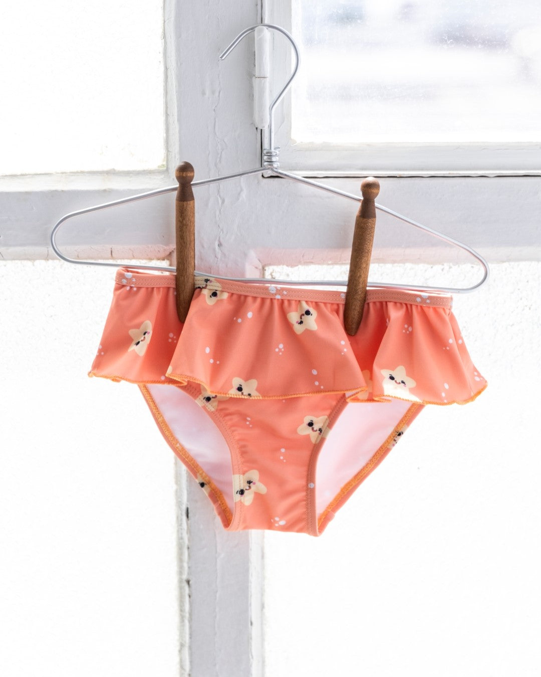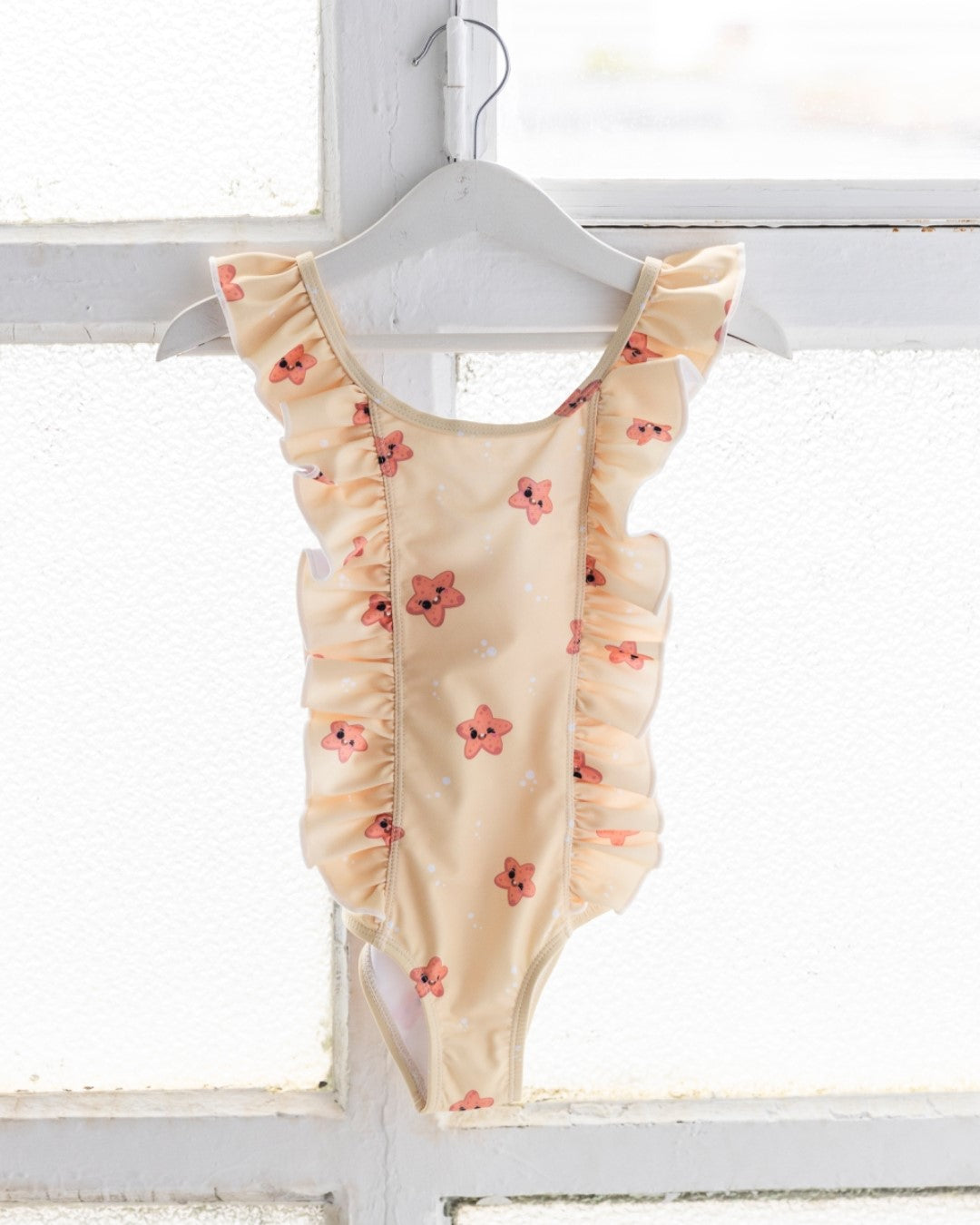 Protege a tu peque del sol con el bañador con volantes con protección solar Estrellitas....